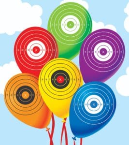 You can use any “Standard” handgun chambered for any PISTOL caliber (.25, 32, 9mm, 38, 40, 41, 44, 45, 50) but no black powder. There will be 5 balloons of different colours mounted on a target stand about 30 feet from the shooting position. You will have about 3 seconds to aim and shoot a coloured balloon as called out by the range operator.